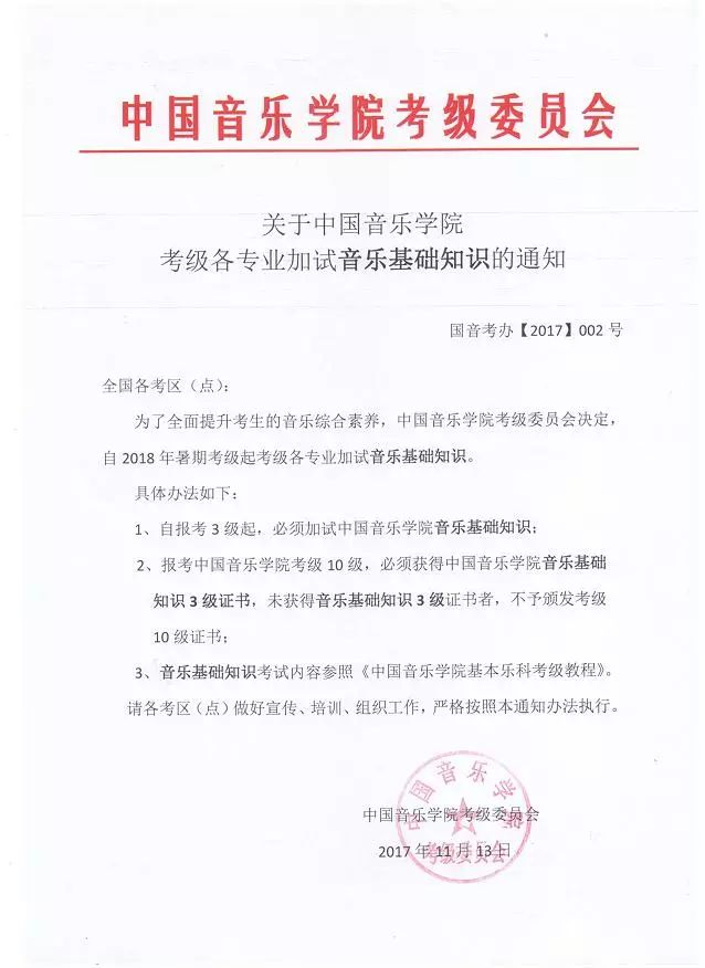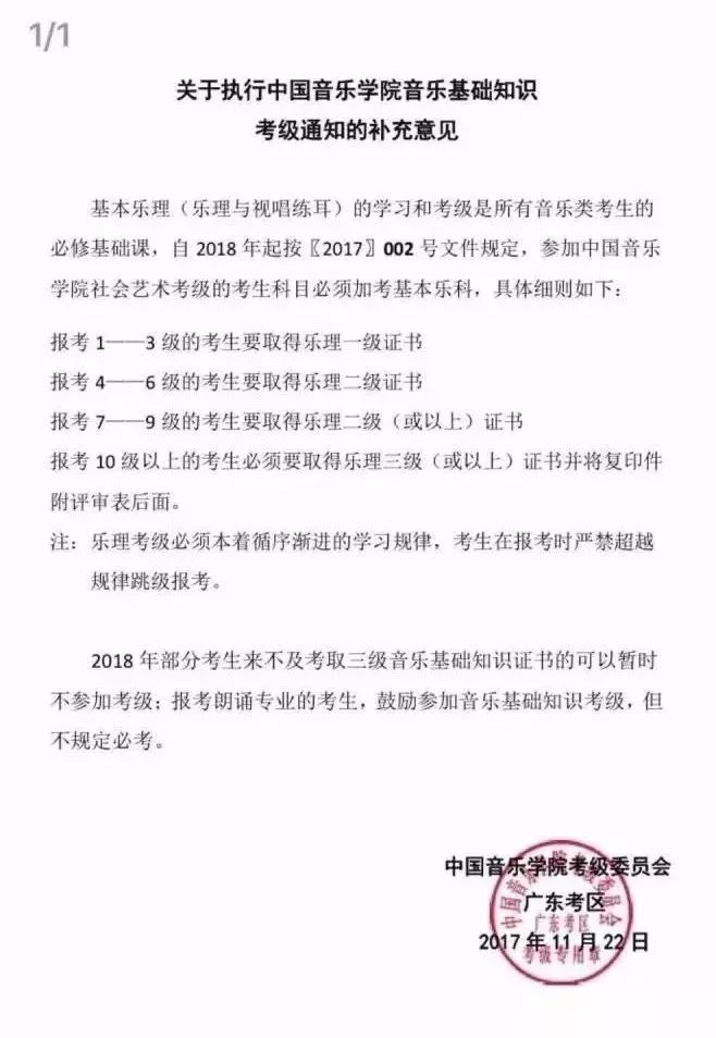 上个月,中国音乐学院考级委员会发布的《关于中国音乐学院考级各专业加试音乐基础知识的通知》里正式要求,从明年暑假考级开始,中国音乐学院考级将音乐基础知识正式加入考级考试项目。这是继中央音乐学院考级中心后又一考级认证机构将音基考试合格证纳入硬性考核标准。
