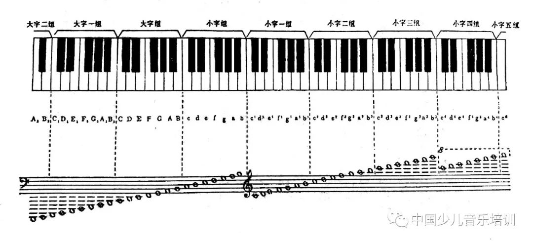 注:位于键盘中心的c称为中央c,也叫小字一组c,记录为c1,向上一个八度为记为c2,向下八度为c;还有一种国际上通用的键盘对照表,中央c被记录为c4,向上一个八度记为c5,反方向低八度称为c3,因此钢琴键盘的最高音为c8。