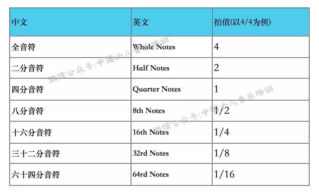 注:每一个音符都有与之时值相同的、用于标记音乐停顿或静止的记号,称为休止符,例:四分音符→四分休止符