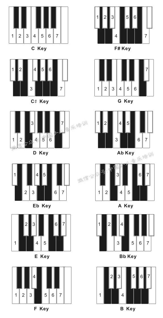 注2:以上调号范例中,♯C=♭D 、♯F=♭G 、B=♭C,所以总共有12种排列组合