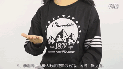9、手心向上,最大限度地伸展五指,同时下臂回转。