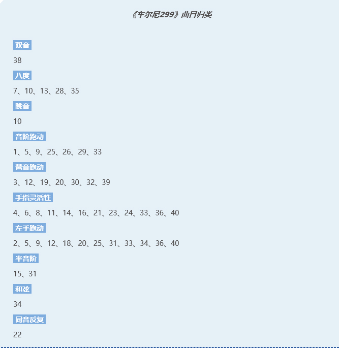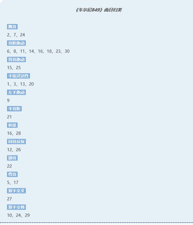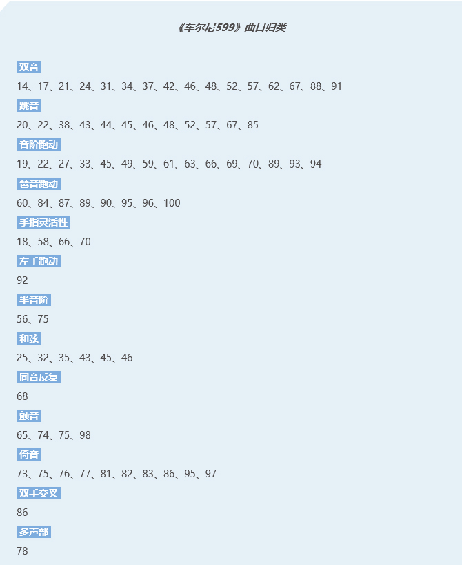 所以,在练习时首先要明确《车尔尼练习曲》中每首作品所练习的重点。而在孩子练习乐曲时遇到的各种技术难点,也可以通过练习或是复习《车尔尼练习曲》中训练同样技术的曲目而得到改进。因此,哆哆为大家总结了《车尔尼练习曲》作品599、849、740中大多数作品所训练的技术点,以便孩子练习和老师教学时进行参考。(一些侧重点不明显的曲目未进行归类)