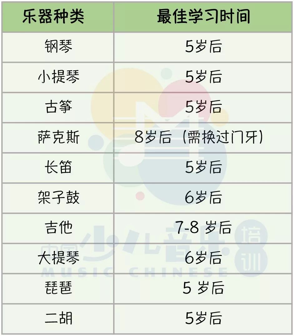 为此,我们根据中央音乐学院儿童音乐培养方案,为大家整理了一份详细的针对各种乐器适合学习的年龄阶段指南,供大家参考。