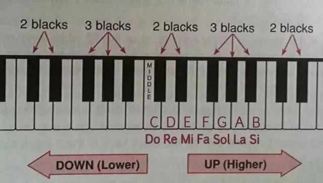 每7个白键(包括5个黑键)是一组。琴键越往右边,则音高越高,越往左边,则音高越低。大家先找到2个一组的黑键,它前面的那个音就是Do,即简谱1。