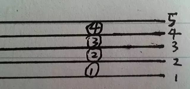 五条线和四个“间”从下至上排序,分别是:第一线、第一间;第二线、第二间;第三线、第三间;第四线、第四间;第五线。