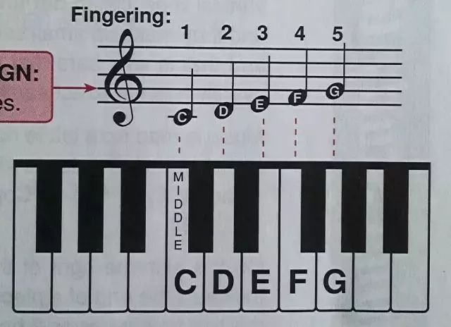 你记住了第三间这个音是Do,它在琴上位于中央C右边的第一个Do(两个一组的黑键像把剪刀,剪刀前面那个白键就是Do)。