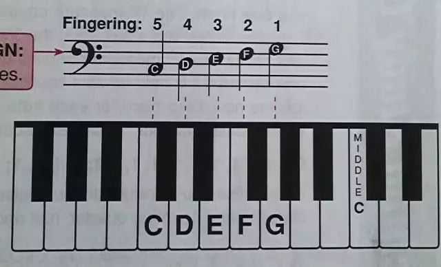它在低音谱表上的位置是在“第二间”,可以用5号手指在琴上按下去。