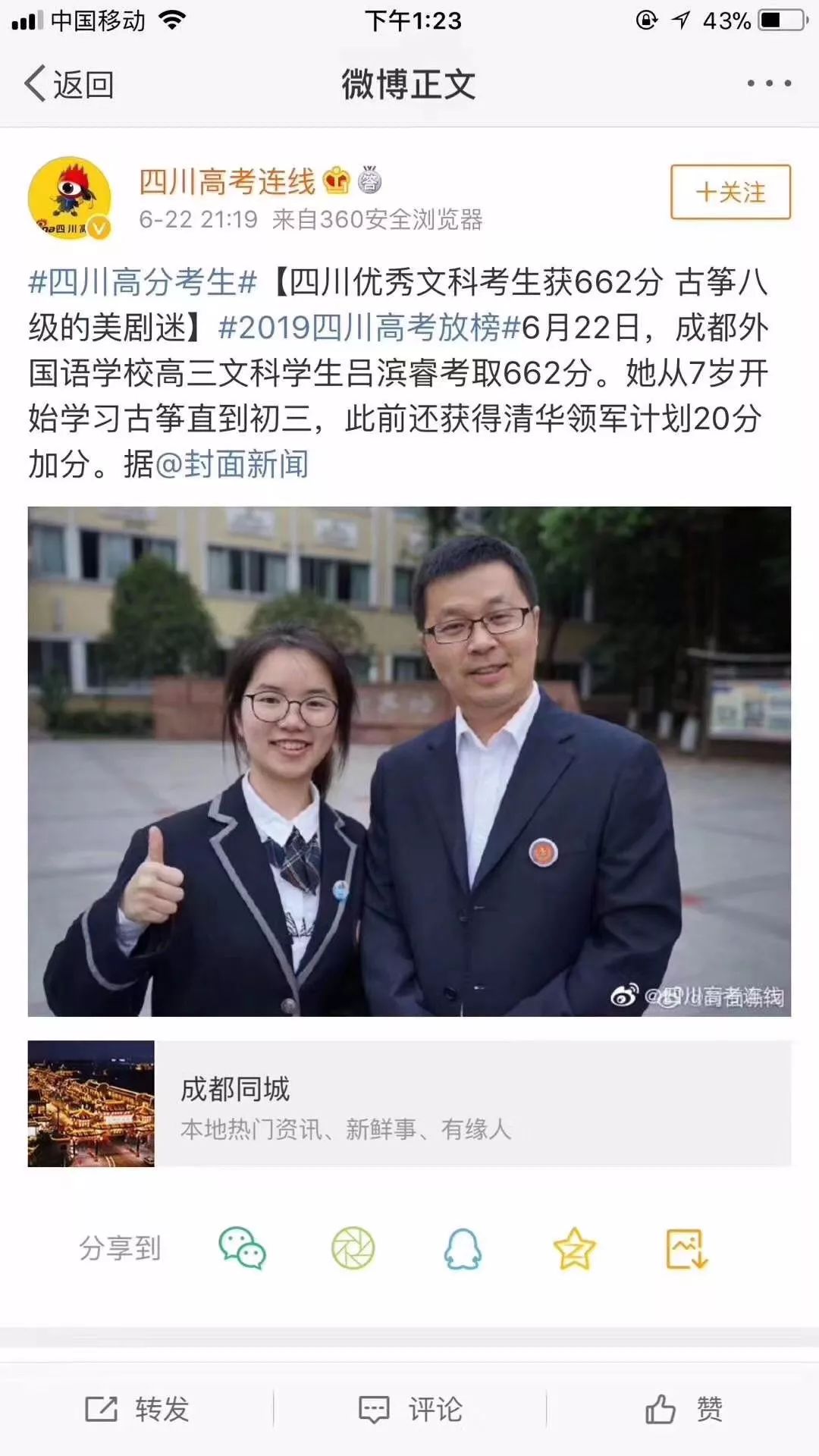 2019年四川文科状元吕滨睿:古筝八级,并获得清华20分加分。