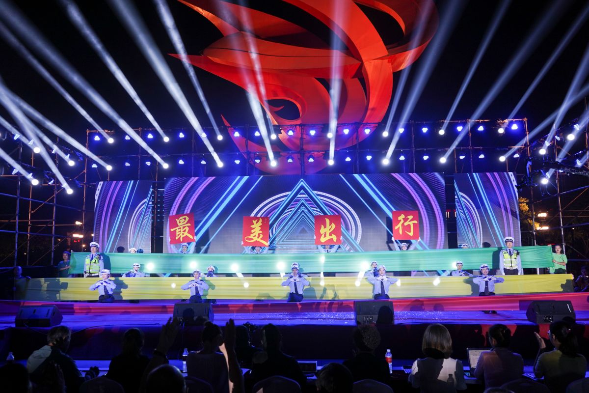 “最美的速度最文明,最美的出行一路顺风……”当晚,一曲欢快的广场舞《最美出行》拉开了决赛的序幕,300多名参赛选手、观众同舞,台上台下成了一片舞蹈的海洋。比赛现场,参赛队员们舞姿翩翩、各显风采,台上精彩不断,台下掌声连连。队员中有身着队服的群众,也有身穿制服的民警,他们个个精神饱满、神采飞扬,伴随着动感的旋律,时而变换队形、时而做出交警指挥手势。