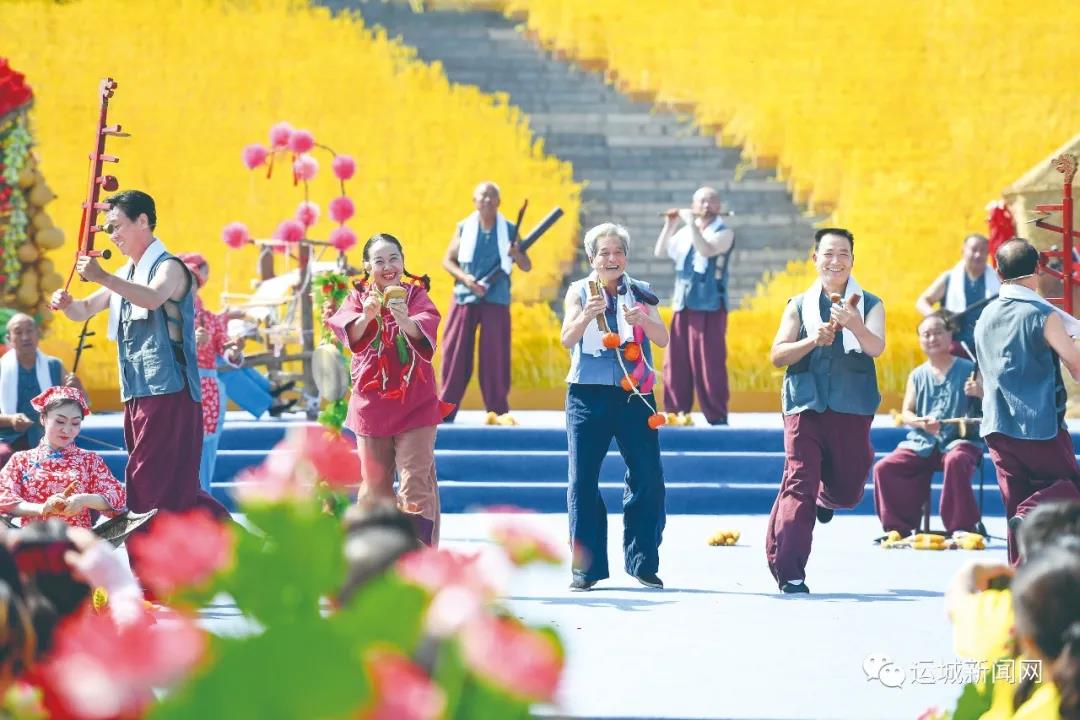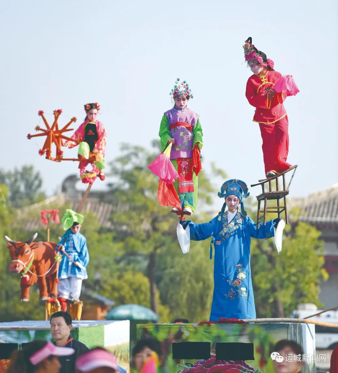 具有浓郁永济地方文化特色的舞龙舞狮、花伞、背冰、道情、高抬、划旱船等民俗文艺表演悉数亮相,为农民丰收节增添了浓浓的欢庆氛围。其中,永济省级非物质文化遗产亮宝和特色民俗表演耍玄、划旱船、高抬等,伴随着欢快的《大丰收》歌声开场亮相,看点十足;歌舞表演《亮膘的汉子》融入永济国家级非物质文化遗产背冰元素,演员们光着膀子,身背冰块,展现了黄河汉子坚韧豪迈的精神;省级非物质文化遗产永济道情,唱出了黄河岸边黄河人的丰收喜悦;舞龙舞狮热闹非凡,张营镇的麻狮表演已有三四百年的历史,兼具北方文狮和南方武狮的特点,是开场民俗表演的一大亮点;永济市委宣传部为这次歌会专门创作的大型歌舞节目《大山大河庆丰收》,内容丰富,有歌有舞,有说有唱,有民俗展示,分层次多维度展现了永济人民的幸福生活和积极向上的精神风貌……一个个“土味”十足的本地文艺节目,将原汁原味的永济本土文化和永济人民欢天喜地庆丰收、勠力同心迎小康的精气神,透过丰收歌会这一舞台,展现给全国观众。