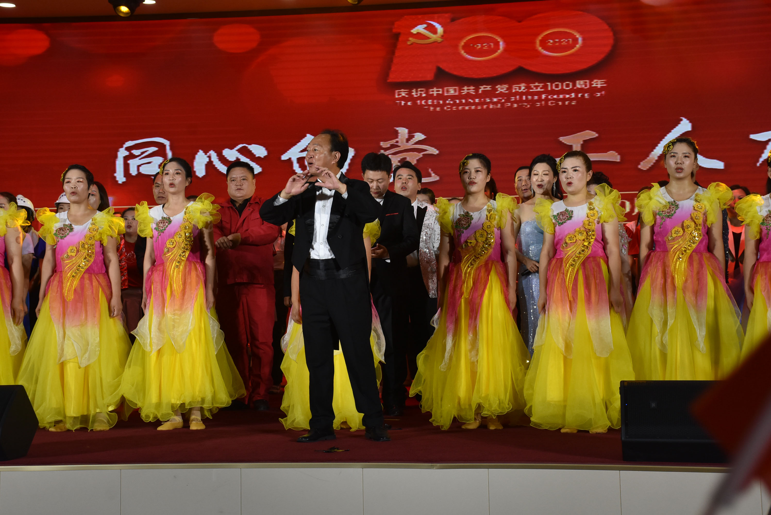 演出在百人大合唱《咱们工人有力量》嘹亮的歌声中拉开了序幕,这支气势恢宏的合唱团队由盐湖区工科局全体人员和全区规模以上企业负责人组成。整个演出以时间为轴依次展开,通过我区15家工业企业单位选送的精彩纷呈的文艺节目,为观众完美呈现了中国共产党团结带领中国人民不懈奋斗的辉煌历程。从《南湖的船,党的摇篮》的大事变到《我为祖国献石油》的主人翁精神,从《在灿烂阳光下》沐浴改革开放的春风,到举起伟大梦想的《新时代工人走起来》,一曲曲壮歌催人奋进,一支支劲舞擂响战鼓。最后,全场人员齐声高唱《没有共产党就没有新中国》,将演出推向了高潮。